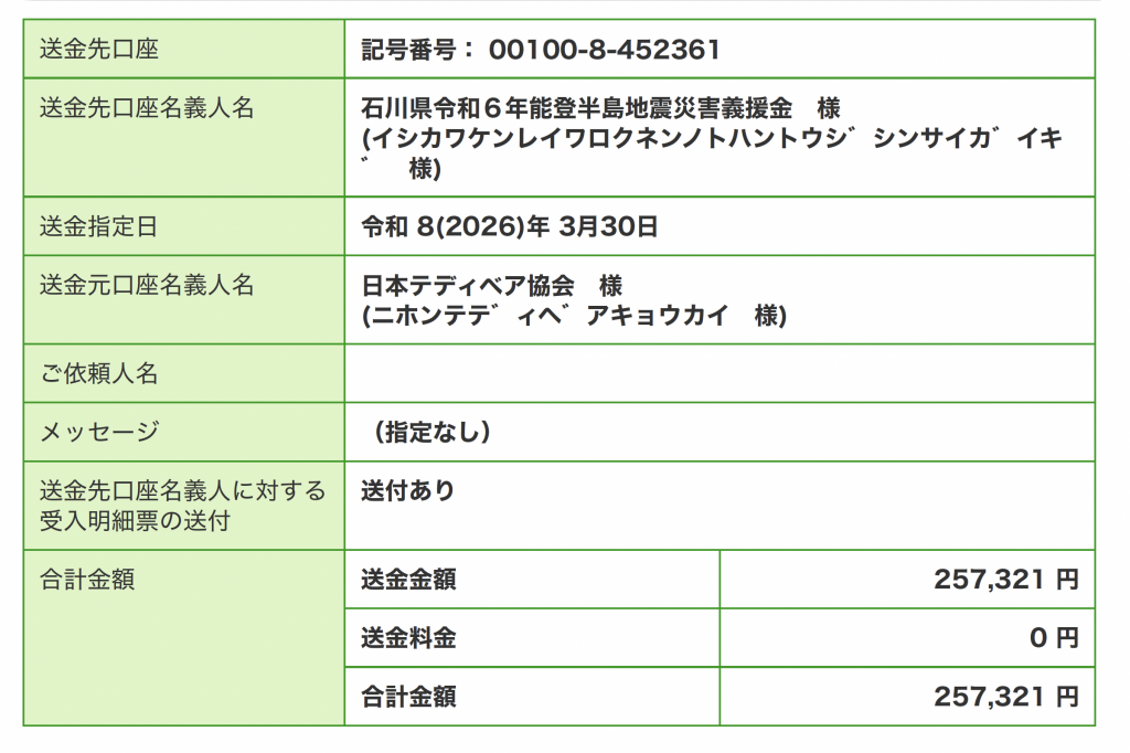 日本テディベア協会は、昨年実施いたしましたチャリティラッフルによる収益(経費を除く)の全額を石川県へ寄付し、被災地支援の一助とさせていただきましたことをご報告申し上げます。