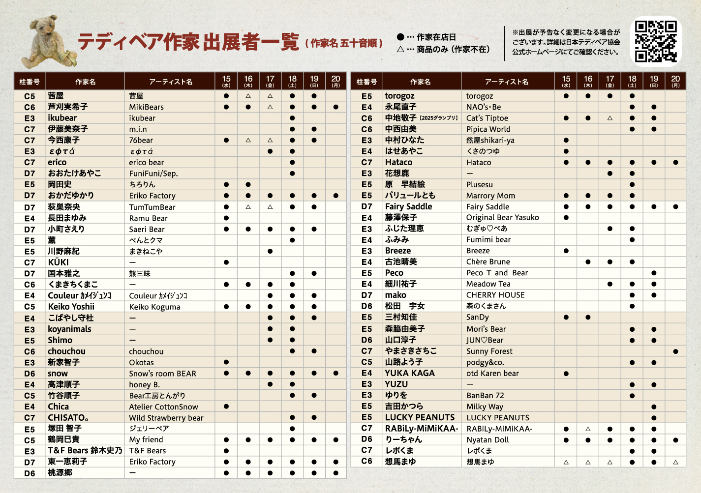 ●…作家在店日 △…商品のみ (作家不在)